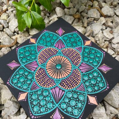 Lila-türkiz-lazac színű pontozott mandala – 15×15 cm